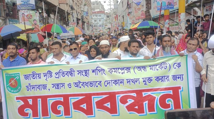 সন্ত্রাস ও চাঁদাবাজদের নির্লজ্জ আগ্রাসনের বিরুদ্ধে মুখ খুলেছে দেশের অন্যতম প্রান্তিক জনগোষ্ঠী — দৃষ্টি প্রতিবন্ধীরা। শনিবার (২৮ জুন) দুপুর ১২টায় জাতীয় দৃষ্টি প্রতিবন্ধী সংস্থার (জাদিপ্রস) অধীনস্থ সাভারের এনএফভিআই শপিং কমপ্লেক্স (অন্ধ মার্কেট) রক্ষার দাবিতে চার শতাধিক প্রতিবন্ধী মানববন্ধন করেন।