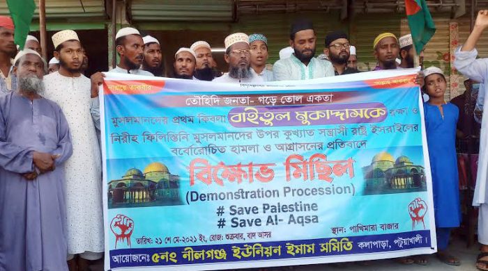 মুসলমানদের প্রথম কিবলা বাইতুল মুকাদ্দাসকে রক্ষা ও নিরীহ ফিলিস্তিনিদের উপর কুখ্যাাত সন্ত্রাসী ইসরাইলের বর্বরোচিত হামলা ও অগ্রাসনের প্রতিবাদে পটুয়াখালীর কলাপাড়া উপজেলার নীলগঞ্জ ইউনিয়নের পাখিমারা বাজারে বিক্ষোভ মিছিল ও প্রতিবাদ সভা হয়েছে।