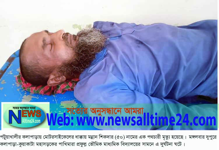 মো.ফরিদ উদ্দিন বিপু, কলাপাড়া(পটুয়াখালী)প্রতিনিধি,০৭জুলাই।। পটুয়াখালীর কলাপাড়ায় মোটরসাইকেলের ধাক্কায় মন্নান শিকদার (৫০) নামের এক পথচারীর মৃত্যু হয়েছে। এসময় আহত হয়েছে মোটর সাইকেল চালক মিজান (২২)। মঙ্গলবার দুপুরে কলাপাড়া-কুয়াকাটা মহাসড়কের পাখিমারা প্রফুল্ল ভৌমিক মাধ্যমিক বিদ্যালয়ের সামনে এ দুর্ঘটনা ঘটে। স্থানীয়রা রক্তাক্ত অবস্থায় চালককে উদ্ধার করে কলাপাড়া হাসপাতালে নিয়ে আসে। কর্তব্যরত চিকিৎসক পথচারী মান্নানকে মৃত ঘোষনা করেন। মৃত মন্নান উপজেলার নীলগঞ্জ ইউনিয়নের নাওভাঙ্গা গ্রামের মৃত শাহআলম শিকদারের ছেলে বলে জানা গেছে।