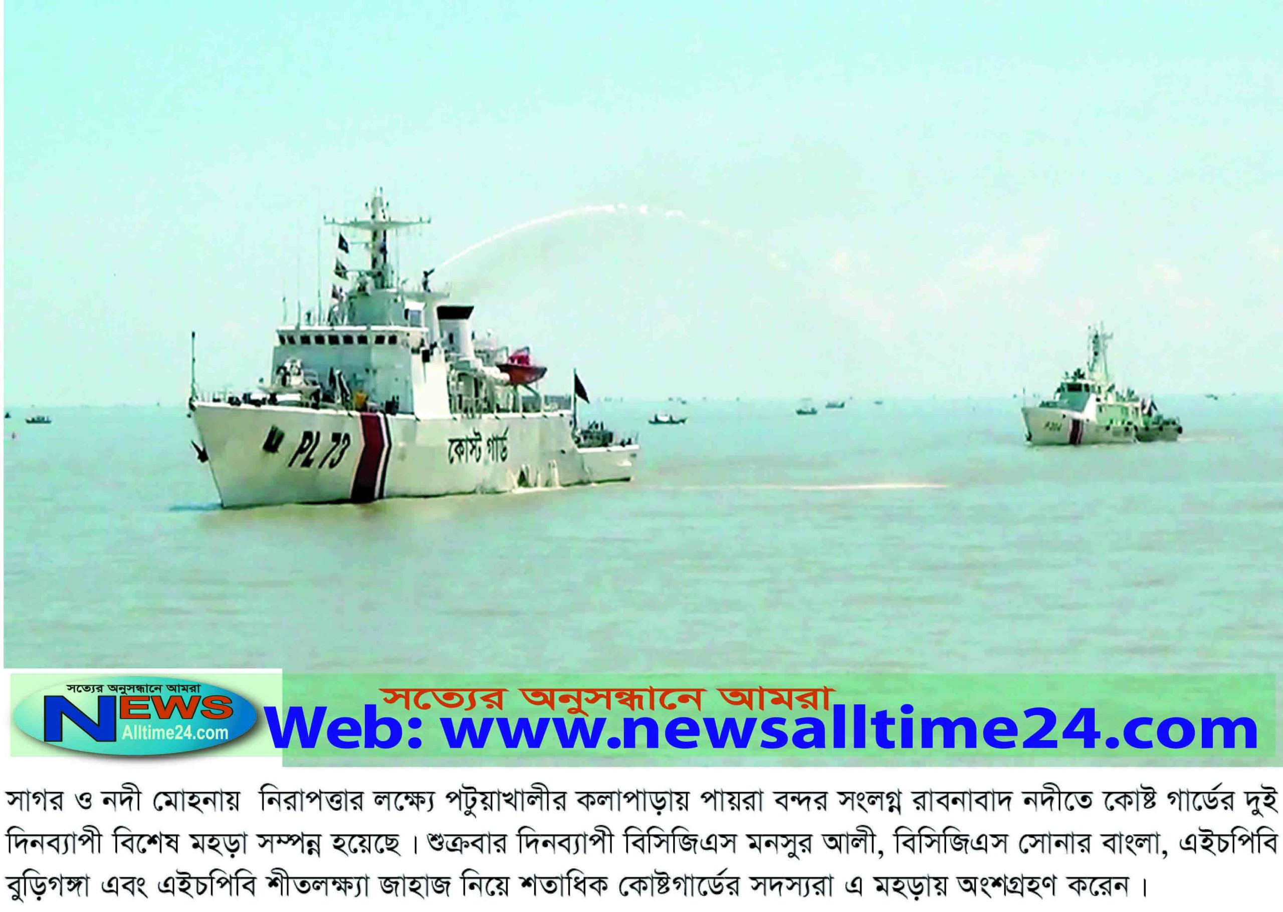 সাগর ও নদী মোহনায় নিরাপত্তার লক্ষ্যে পটুয়াখালীর কলাপাড়ায় পায়রা বন্দর সংলগ্ন রাবনাবাদ নদীতে কোষ্ট গার্ডের দুই দিনব্যাপী বিশেষ মহড়া সম্পন্ন হয়েছে। শুক্রবার দিনব্যাপী বিসিজিএস মনসুর আলী, বিসিজিএস সোনার বাংলা, এইচপিবি বুড়িগঙ্গা এবং এইচপিবি শীতলক্ষ্যা জাহাজ নিয়ে শতাধিক কোষ্টগার্ডের সদস্যরা এ মহড়ায় অংশগ্রহণ করেন।