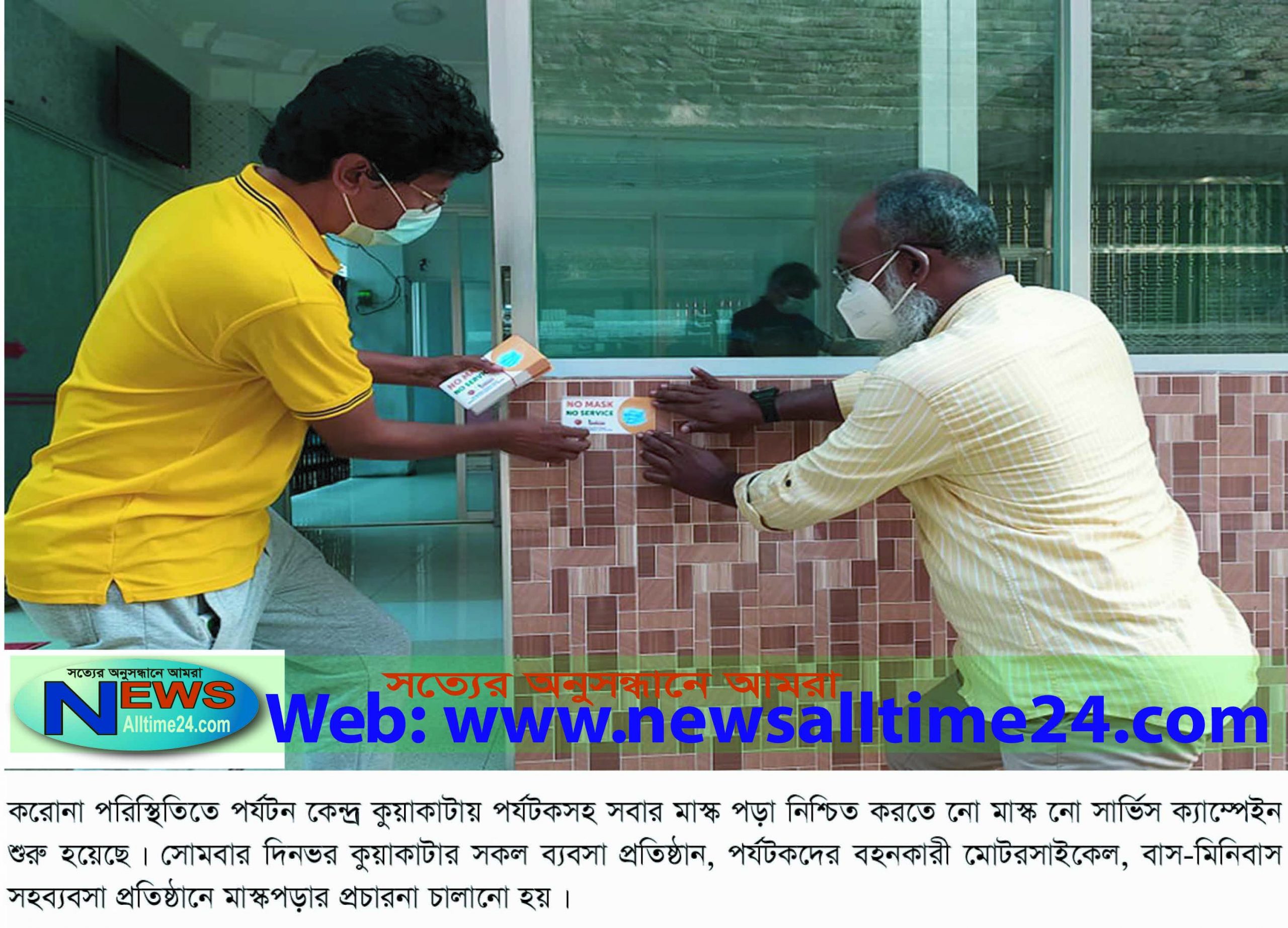 নিরাপদ পর্যটন গড়তে ও স্বাস্থ্য বিধি মেনে পর্যটকদের ভ্রমন নিশ্চিত করার লক্ষে বাংলাদেশ ট্যুরিজম বোর্ড এর উদ্যোগে ট্যুর অপারেটরস এসোসিয়েশন অব কুয়াকাটা (টোয়াক) সহযোগীতায় কুয়াকাটায় নো মাস্ক নো সার্ভিস কর্মসূচী অব্যাহত রয়েছে। গতকাল থেকে টোয়াকের সকল সদস্যরা পর্যটন নগরী কুয়াকাটার আবাসিক হোটেল, রেস্টুরেন্ট, পরিবহন, বাস, অটো ও মটরসাইকেল, ব্যাংক, বীমা অফিস, ব্যবসা প্রতিষ্ঠানে সচেতনতা মূলক স্টিকার লাগানো সহ স্থানীয় ও পর্যটকদের সচেতন করা হয়। আগামী কয়েকদিন চলবে এমন সচেতনতা কর্মসূচী। ট্যুর অপারেটরস এসোসিয়েশন অব কুয়াকাটা (টোয়াক) এর সভাপতি রুমান ইমতিয়াজ তুষার বলেন, আমরা কুয়াকাটা পর্যটন ও ট্যুরিস্টদের শত ভাগ নিরাপদ রাখতে ট্যুরিজম বোর্ডের সাথে সমস্বয় করে সচেতনতা মূূলক প্রচারাভিযান চালিয়ে যাচ্ছি। কুয়াকাটা আগত পর্যটক সহ সকল ব্যবসা প্রতিষ্ঠান যাতে নিরাপদ থাকে সে চেষ্টা আমাদের অব্যাহত থাকবে।
