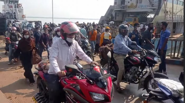 বিজিবি মোতায়েন, মহাসড়কে পুলিশের তল্লাশির পরও থেমে নেই ঘরমুখী মানুষের যাত্রা। সিএনজি অটোরিকশায় বা প্রাইভেটকারে কিংবা পায়ে হেঁটে, যে যেভাবে পারছেন ছুটছেন পদ্মার পাটুরিয়া ফেরিঘাটে। ঘাট এলাকা ও ফেরিতে হাজারো মানুষের ভিড়ে চরমভাবে উপেক্ষিত স্বাস্থ্যবিধি। অনেকে দৌড় দিচ্ছেন ফেরি ধরার জন্য, যে কোনো মূল্যে উঠতে হবে ফেরিতে। যত কষ্টই হোক না কেনো পৌছাতে হবেই বাড়ি।