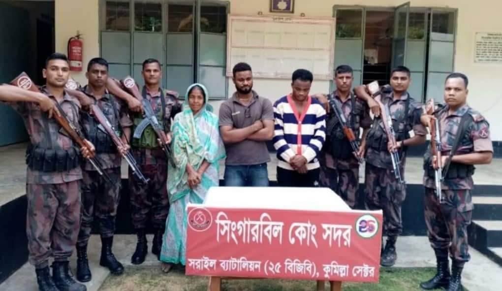 সোমবার দুপুরের দিকে উপজেলার সিঙ্গারবিল ইউনিয়নের নলগরিয়া এলাকা থেকে বিজিবির ২৫ ব্যাটালিয়নের সদস্যরা তাদের আটক করেন।