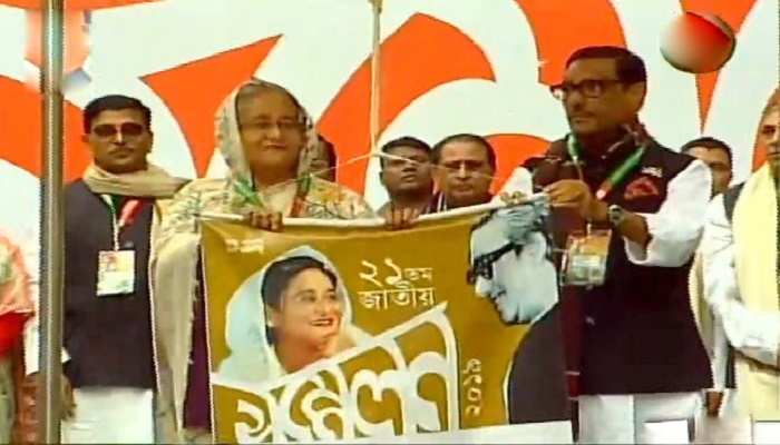 সোনাই ডেক্স: আওয়ামী লীগের ২১তম জাতীয় সম্মেলনের আনুষ্ঠানিক উদ্বোধন করেছেন দলটির সভাপতি ও প্রধানমন্ত্রী শেখ হাসিনা। শুক্রবার বেলা তিনটার দিকে সোহরাওয়ার্দী উদ্যানে সমাবেশ মঞ্চের পাশে জাতীয় পতাকা উত্তোলন করেন তিনি।