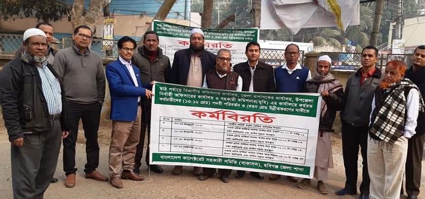 উল্লেখ্য, সারা দেশের বিভাগীয় কমিশনার, জেলা প্রশাসক, উপজেলা নির্বাহী কর্মকর্তা ও সহকারী কমিশনার(ভূমি)’র কার্যালয়ে কর্মরত ৩য় শ্রেনীর কর্মচারীদের পদনাম ও বেতন স্কেল পরিবর্তনের দাবী আদায়ের লক্ষ্যে হবিগঞ্জের ২শতাধিক কর্মচারী সকাল ৯টা থেকে বিকাল ৪টা পর্যন্ত কর্ম বিরতি পালন করে যাচ্ছে।