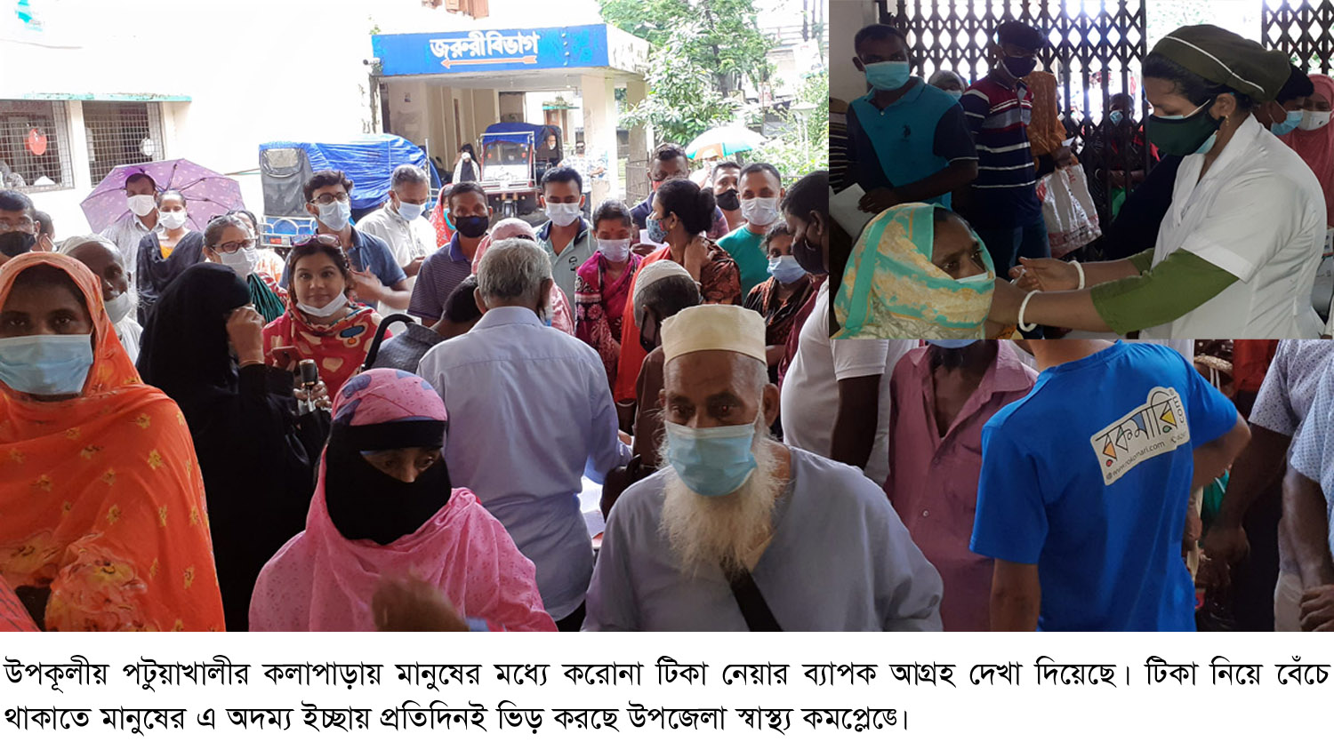 উপক‚লীয় পটুয়াখালীর কলাপাড়ায় মানুষের মধ্যে করোনা টিকা নেয়ার ব্যাপক আগ্রহ দেখা দিয়েছে। টিকা নিয়ে বেঁচে থাকাতে মানুষের এ অদম্য ইচ্ছায় প্রতিদিনই ভিড় করছে উপজেলা স্বাস্থ্য কমপ্লেক্সে। কেউ কেউ হাসপাতালের অফিস রুমের সামনে সকাল থেকে দুপুর পর্যন্ত অপেক্ষা করছে। এছাড়া চলমান কঠোর বিধি-নিষেধে কম্পিউটারের দোকান বন্ধ থাকায় রেজিষ্ট্রেশনের না পেরে অনেকেই বাড়ী ফিরে গেছে।