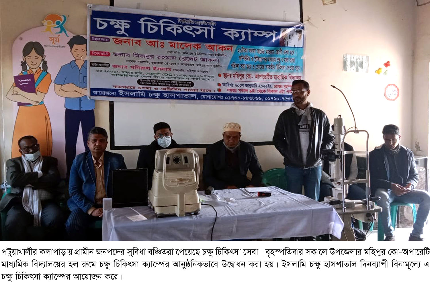 পটুয়াখালীর কলাপাড়ায় গ্রামীন জনপদের সুবিধা বঞ্চিতরা পেয়েছে চক্ষু চিকিৎসা সেবা। বৃহস্পতিবার সকালে উপজেলার মহিপুর কো-অপারেটি মাধ্যমিক বিদ্যালয়ের হল রুমে চক্ষু চিকিৎসা ক্যাম্পের আনুষ্ঠনিকভাবে উদ্বোধন করা হয়। ইসলামি চক্ষু হাসপাতাল দিনব্যাপী বিনামূল্যে এ চক্ষু চিকিৎসা ক্যাম্পের আয়োজন করে।