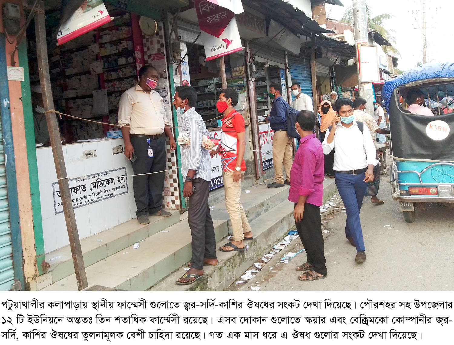 পটুয়াখালীর কলাপাড়ায় স্থানীয় ফাম্মের্সী গুলোতে জ্বর-সর্দি-কাশির ঔষধের সংকট দেখা দিয়েছে। পৌরশহর সহ উপজেলার ১২ টি ইউনিয়নে অন্ততঃ তিন শতাধিক ফার্ম্মেসী রয়েছে। এসব দোকান গুলোতে স্কয়ার এবং বেক্্িরমকো কোম্পানীর জ্বর-সর্দি, কাশির ঔষধের তুলনামূলক বেশী চাহিদা রয়েছে। রোগীরা সাধারনত এ ঔষধ গুলো ক্রয় করেন বেশী। গত এক মাস ধরে এ ঔষধ গুলোর সংকট দেখা দিয়েছে। এদিকে, ছোট ছোট ঔষধ ব্যবসায়ীদের অভিযোগ,বড় বড় দোকান গুলোতে মজুদ থাকার কারনে এমন সংকটের সৃষ্টি হয়েছে।