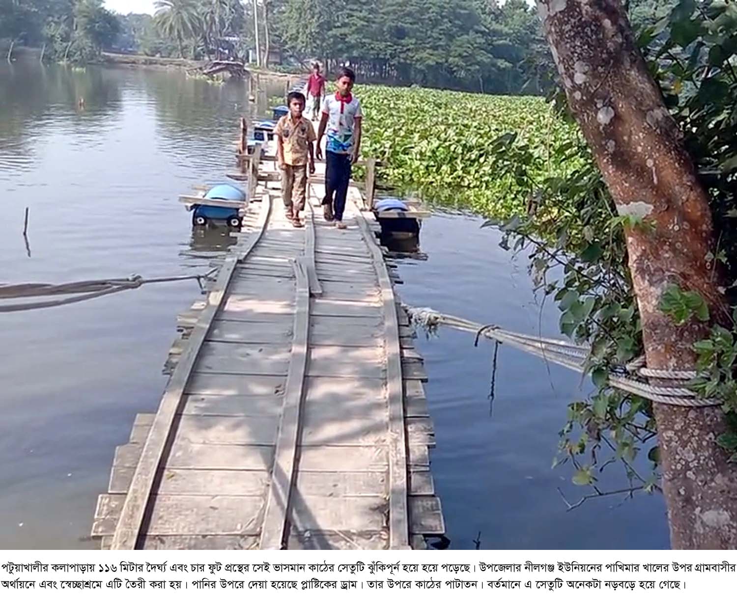 পটুয়াখালীর কলাপাড়ায় ১১৬ মিটার দৈর্ঘ্য এবং চার ফুট প্রস্থের সেই ভাসমান কাঠের সেতুটি ঝুঁকিপূনর্ণ হয়ে হয়ে পড়েছে। উপজেলার নীলগঞ্জ ইউনিয়নের পাখিমার খালের উপর গ্রামবাসীর অর্থায়নে এবং স্বেচ্ছাশ্রমে এটি তৈরী করা হয়। পানির উপরে দেয়া হয়েছে প্লাষ্টিকের ড্রাম। তার উপরে কাঠের পাটাতন। বর্তমানে এ সেতুটি অনেকটা নড়বড়ে হয়ে গেছে। তারপরও কৃষি পল্লী খ্যাত ওই ইউনিয়নের ৫ গ্রামের ১০ হাজার মানুষ কোন উপায়ন্ত না পেয়ে ঝুঁকি নিয়ে এ সেতু দিয়ে পরাপার হচ্ছে। এতে প্রায়শই ঘটছে ছোট বড় দুর্ঘটনা। তবে এ খালের উপর একটি স্থায়ী ব্রিজ নির্মাণের দাবি জানিয়েছেন স্থানীয়রা।