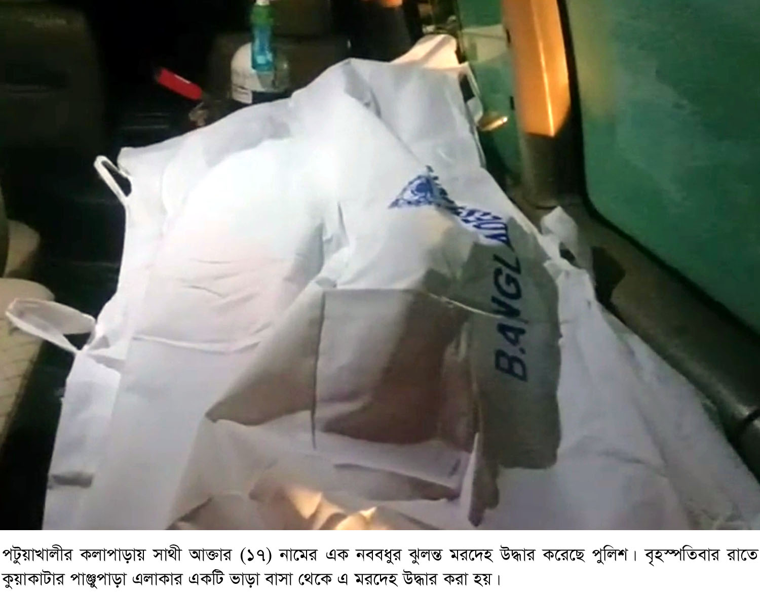 পটুয়াখালীর কলাপাড়ায় সাথী আক্তার (১৭) নামের এক নববধুর ঝুলন্ত মরদেহ উদ্ধার করেছে পুলিশ। বৃহস্পতিবার রাতে কুয়াকাটার পাঞ্জুপাড়া এলাকার একটি ভাড়া বাসা থেকে এ মরদেহ উদ্ধার করা হয়। এ ঘটনায় মৃত সাথীর পিতা হারুন সরদার বাদি হয়ে মাহিপুর থানায় একটি মামলা করেছে। পুলিশ ওইরাতে স্বামী জাহিদুল ইসলাম (২৭) কে গ্রেফতার করেছে। শুক্রবার সকালে নববধুর লাশ ময়না তদন্তের জন্য মর্গে পাঠানো হয়েছে।