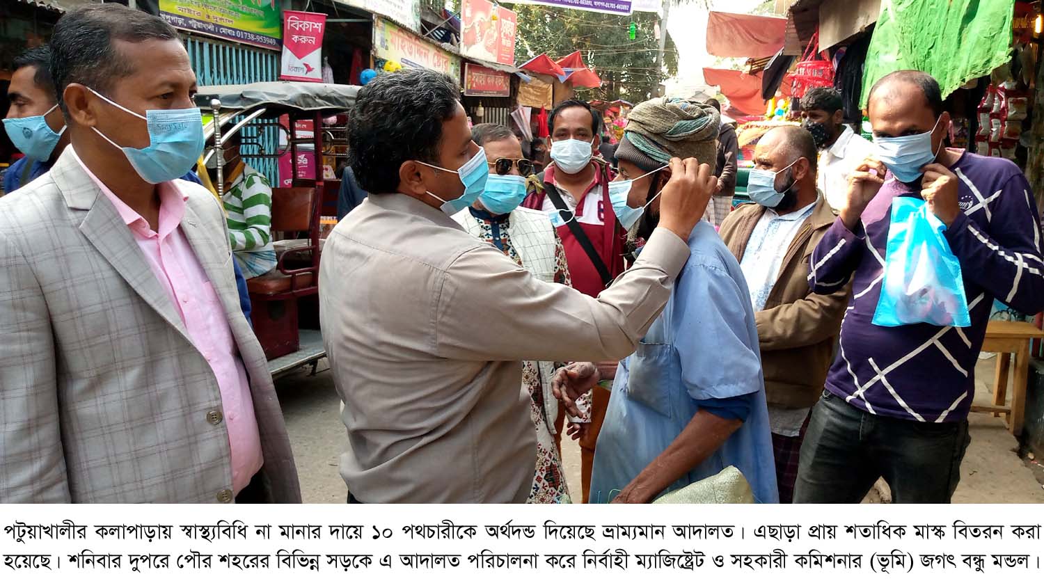 পটুয়াখালীর কলাপাড়ায় স্বাস্থ্যবিধি না মানার দায়ে ১০ পথচারীকে অর্থদন্ড