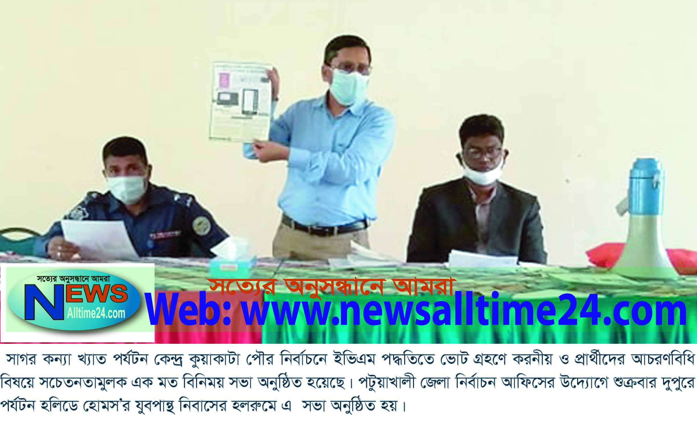 সাগর কন্যা খ্যাত পর্যটন কেন্দ্র কুয়াকাটা পৌর নির্বাচনে ইভিএম পদ্ধতিতে ভোট গ্রহণে করনীয় ও প্রার্থীদের আচরণবিধি বিষয়ে সচেতনতামুলক এক মত বিনিময় সভা অনুষ্ঠিত হয়েছে। পটুয়াখালী জেলা নির্বাচন আফিসের উদ্যোগে শুক্রবার দুপুরে পর্যটন হলিডে হোমস’র যুবপান্থ নিবাসের হলরুমে এ সভা অনুষ্ঠিত হয়। উপজেলা নির্বাচন কর্মকর্তা আব্দুর রশিদ’র সভাপতিত্বে সভায় বক্তব্য রাখেন, জেলা নির্বাচন কর্মকর্তা মো.জিয়াউর রহমান খলিফা, মাহিপুর থানার ভারপ্রাপ্ত কর্মকর্তা মো. মনিরুজ্জামান।