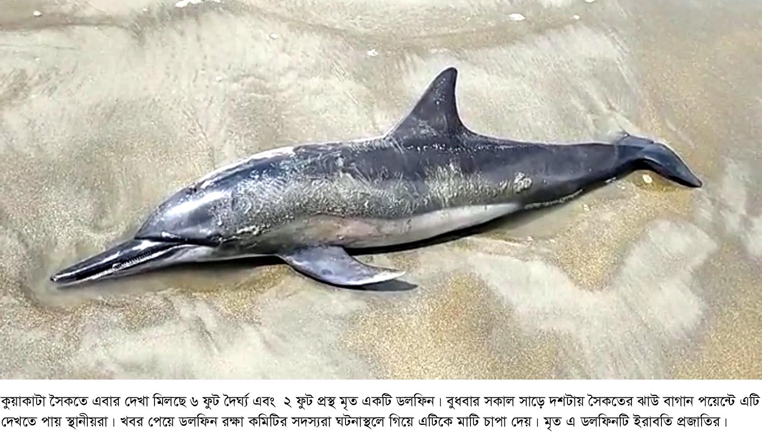 কুয়াকাটা সৈকতে এবার দেখা মিলছে ৬ ফুট দৈর্ঘ্য এবং ২ ফুট প্রস্থ মৃত একটি ডলফিন। বুধবার সকাল সাড়ে দশটায় সৈকতের ঝাউ বাগান পয়েন্টে এটি দেখতে পায় স্থানীয়রা। খবর পেয়ে ডলফিন রক্ষা কমিটির সদস্যরা ঘটনাস্থলে গিয়ে এটিকে মাটি চাপা দেয়।