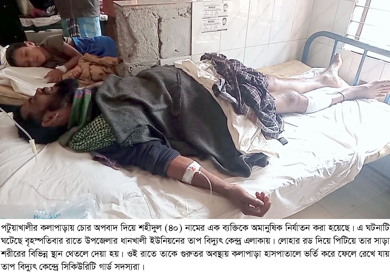 পটুয়াখালীর কলাপাড়ায় চোর অপবাদ দিয়ে শহীদুল (৪০) নামের এক ব্যক্তিকে অমানুষিক নির্যাতন করা হয়েছে। এ ঘটনাটি ঘটেছে বৃহস্পতিবার রাতে উপজেলার ধানখালী ইউনিয়নের তাপ বিদ্যুৎ কেন্দ্র এলাকায়। লোহার রড দিয়ে পিটিয়ে তার শরীরের বিভিন্ন স্থান থেতলে দেয়া হয়। ওই রাতে তাকে গুরুতর অবস্থায় কলাপাড়া হাসপাতালে ভর্তি করে ফেলে রেখে যায় তাপ বিদ্যুৎ কেন্দ্রে সিকিউরিটি গার্ড সদস্যরা।