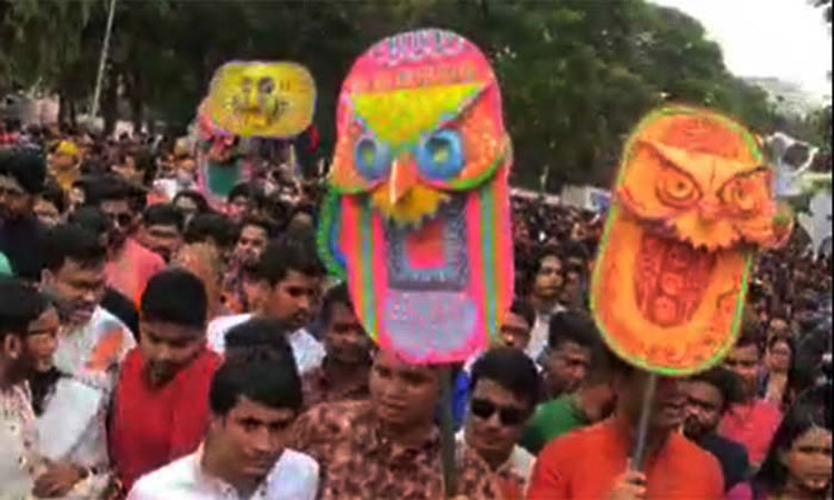 পুরোনো গ্লানি, হতাশা আর মলিনতাকে পেছনে ফেলে নতুন উদ্যমে এগিয়ে যাওয়ার প্রত্যাশায় বাংলা নববর্ষের প্রথম দিনে পয়লা বৈশাখে ঢাকা বিশ্ববিদ্যালয়ে শুরু হয়েছে মঙ্গল শোভাযাত্রা।