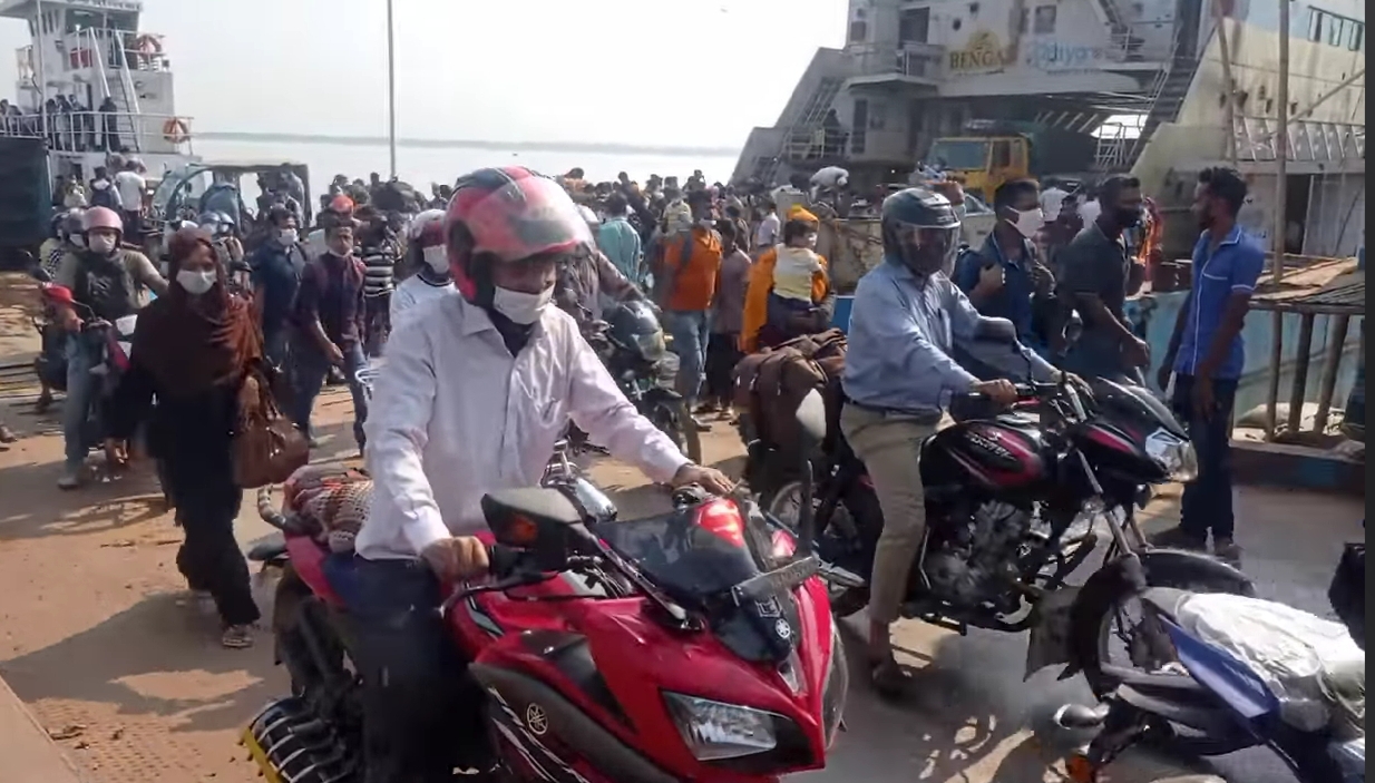 বিজিবি মোতায়েন, মহাসড়কে পুলিশের তল্লাশির পরও থেমে নেই ঘরমুখী মানুষের যাত্রা। সিএনজি অটোরিকশায় বা প্রাইভেটকারে কিংবা পায়ে হেঁটে, যে যেভাবে পারছেন ছুটছেন পদ্মার পাটুরিয়া ফেরিঘাটে। ঘাট এলাকা ও ফেরিতে হাজারো মানুষের ভিড়ে চরমভাবে উপেক্ষিত স্বাস্থ্যবিধি। অনেকে দৌড় দিচ্ছেন ফেরি ধরার জন্য, যে কোনো মূল্যে উঠতে হবে ফেরিতে। যত কষ্টই হোক না কেনো পৌছাতে হবেই বাড়ি।