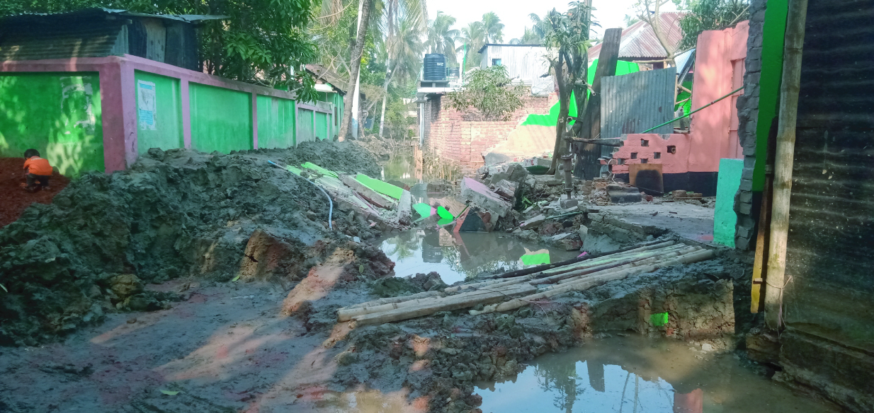 এলাকা বাসির অভিযোগ এই এলাকায় একটু বৃষ্টি হলেই পানি জমে যায় রাস্তা দিয়ে। তবে কাজ হচ্ছে ভালো কিন্তু যেভাবে রাস্তার উপর মাটি ও দেওয়াল ধ্বসে আছে তাতে করে আমাদের আরও বেশি সমস্যা হচ্ছে।