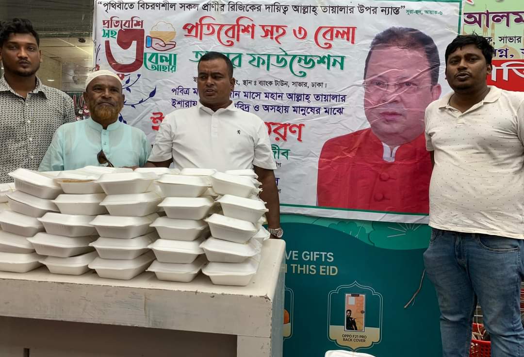 সাভার বাজার বাসস্ট্যান্ডে সিটি সেন্টারের সামনে নিম্ন আয়ের মানুষের মাঝে ইফতার বিতরণ করা হয়। ৩০শে এপ্রিল ২০২২ শনিবার বিকেলে প্রতিবেশীসহ তিনবেলা আহার ফাউন্ডেশনের উদ্যোগে এই ইফতার বিতরণ করা হয়েছে। সাভার উপজেলা আওয়ামী লীগের সাধারণ সম্পাদক ও সাভার উপজেলা পরিষদের চেয়ারম্যান এবং প্রতিবেশীসহ তিন বেলা আহার ফাউন্ডেশনের প্রধান উপদেষ্টা মঞ্জরুল আলম রাজীবের নির্দেশনায় ৩ শতাধিক পরিবারের মাঝে এ ইফতার বিতরণ করা হয়।