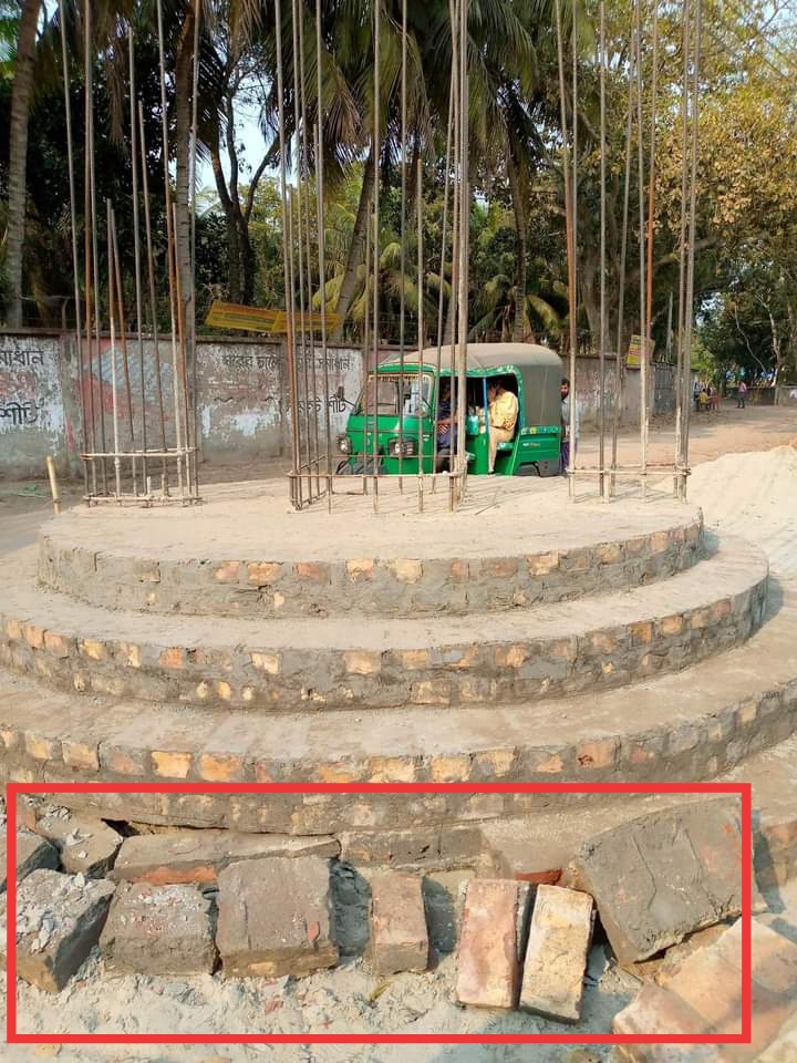 স্থানীয়রা বলেন, নির্মাণাধিন বেদির বালু ও সিমেন্ট দিয়ে গাঁথা ইট স্থাপন করতে না করতেই খুলে যাওয়া শুরু করেছে।বেশ কিছু দিন ধরে কাজ চলছে। এতো দিনে সিমেন্ট জমাট বেঁধে শক্ত হয়ে যাবার কথা। সেখানে আঙ্গল দিয়ে চাপ দিলেই তা খুলে আসছে।