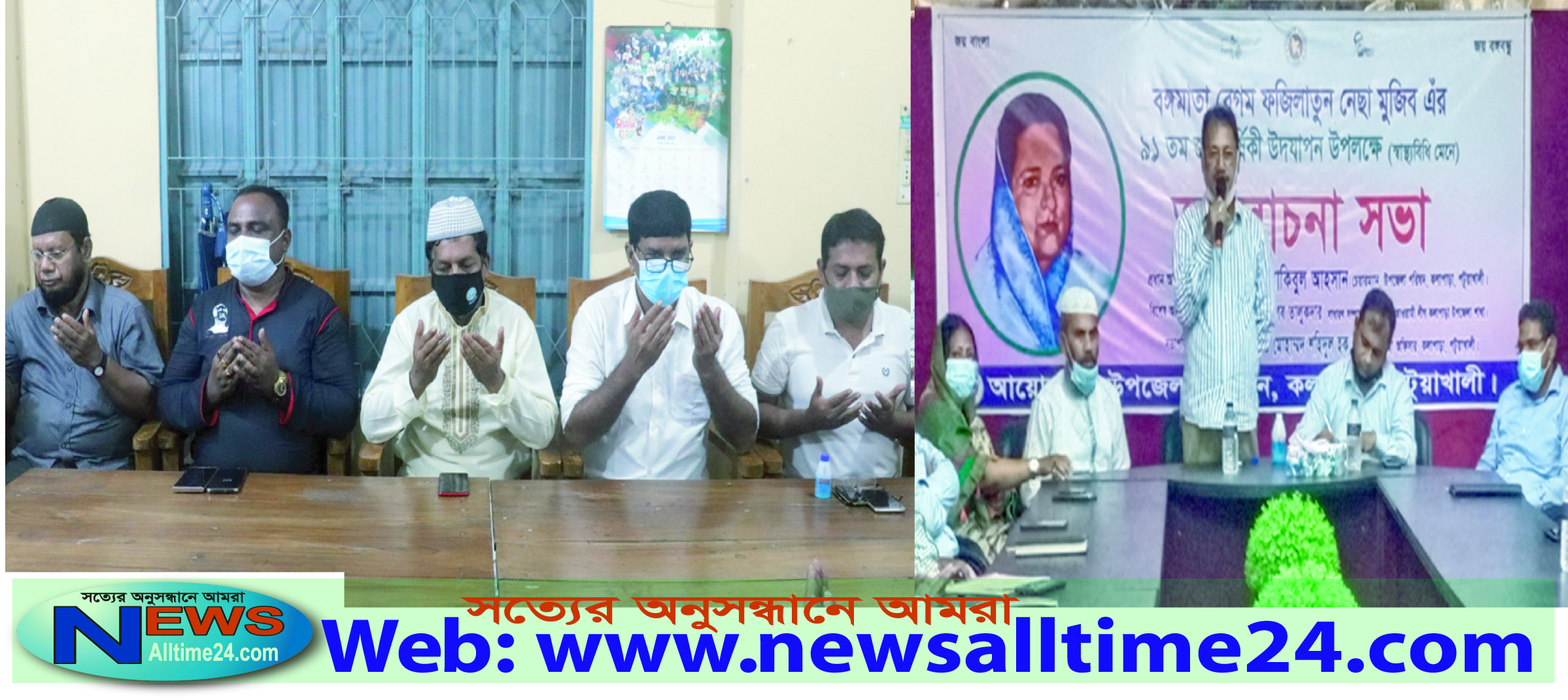জাতির পিতা বুঙ্গবন্ধু শেখ মুজিবুর রহমানের সহধর্মীনি শেখ ফজিলাতুন নেছা মুজিব এর ৯১তম জন্মবার্ষিকী উপলক্ষে দোয়া মোনাজাত ও আলোচনা সভা অনুষ্ঠিত হয়েছে। উপজেলা আওয়ামী লীগের উদ্যোগে রবিবার সকাল ৮টায় আওয়ামী দলীয় কার্যলয়ে এ উপলক্ষে আলোচনা সভা ও দোয়া মোনাজাত অনুষ্ঠিত হয়।