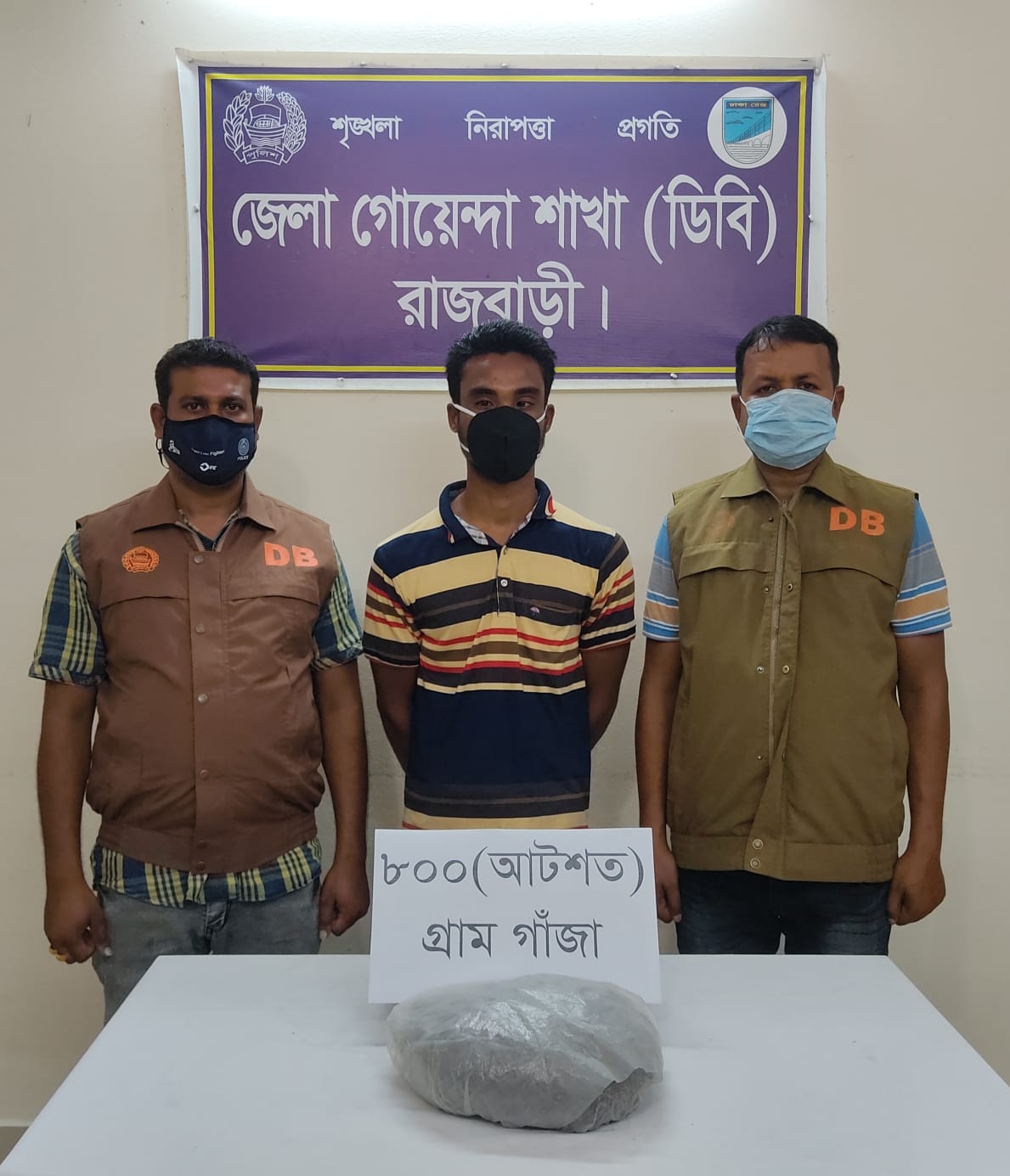 জানাগেছে, শুক্রবার রাত ৭.২০ টার সময় গোপন সংবাদের ভিত্তিতে রাজবাড়ী জেলা গোয়েন্দা শাখা ডিবির এস,আই জাহাঙ্গীর মাতুব্বর, এ,এস,আই মোঃ মেহেদী হাসান, এ,এস,আই মোঃ সামদ মোল্লা সঙ্গীয় ফোর্সসহ বালিয়াকান্দি থানার শহীদ নগর মন্টু স্টোরের সামনে বহরপুর টু রাজধরপুরগামী পাকা রাস্তার উপর থেকে মোঃ সোহেল শেখ (২৬) কে ৮০০ গ্রাম গাঁজা, (মূল্য—২৪ হাজার টাকা) গ্রেফতার করা হয়েছে। মামলা রুজু প্রক্রিয়াধীন।