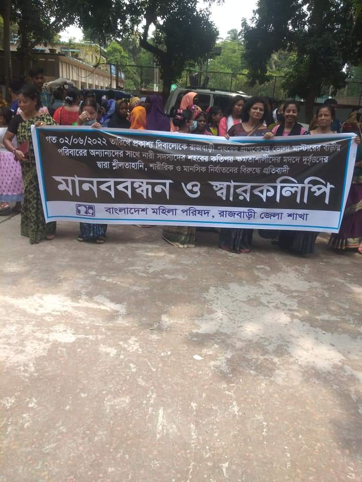 রাজবাড়ী পৌর এলাকার ভবানীপুরে মাস্টার বাড়ীর সীমানা প্রাচীর ভেঙে নারীসহ পাঁচজনকে পিটিয়ে জখম ও নির্যাতন করার প্রতিবাদে মানববন্ধন করেছে বাংলাদেশ মহিলা পরিষদ রাজবাড়ী শাখা।