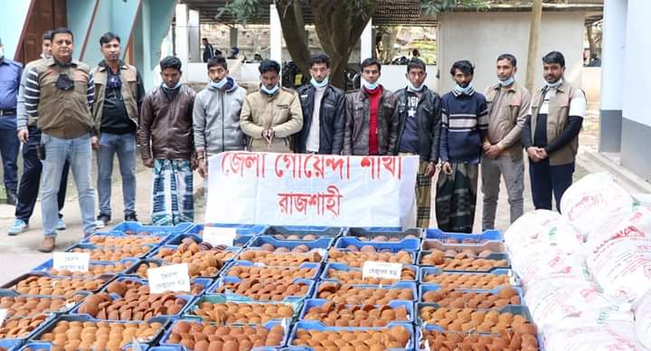 পুলিশ সুপার অফিস সূত্রে জানা যায়, রাজশাহীর সম্মানিত পুলিশ সুপার এ বি এম মাসুদ হোসেন, বিপিএম(বার) মহোদয় এর দিকনির্দেশনায় ডিএসবির অতিরিক্ত পুলিশ সুপার সনাতন চক্রবর্তীর নেতৃত্বে রাজশাহী জেলা গোয়েন্দা শাখার (ডিবি) পুলিশ পরিদর্শক মুহাম্মদ রুহুল আমিনসহ একটি টিম গোপন সংবাদের ভিত্তিতে বাঘা থানাধীন আড়ানী চকরপাড়া এলাকায় একটি ভেজাল খেজুরের গুড় তৈরির কারখানায় বিশেষ অভিযান পরিচালনা করে ৫০ মণ ভেজাল খেজুরের গুড়, ভেজাল গুড় তৈরির বিভিন্ন উপকরণ সামগ্রী জব্দ করাসহ কারখানার মালিকসহ ০৭ জন ব্যক্তিকে আটক করে। আটককৃত ব্যক্তিরা হচ্ছেন, কারখানার মালিক ১। মোঃ রকিব আলী (৪২), পিতা-মৃত আবুল হোসেন ও তার সহযোগী ২। মোঃ সুমন আলী (৪২), পিতা-মোঃ আকবর আলী, ৩। মোঃ অনিক আলী @ পাইলট (৩০), পিতা-মৃত মাজদার রহমান, ৪। মোঃ মাসুদ রানা (৩০), পিতা-মোঃ মোসলেম, ৫। মোঃ বিপ্লব হোসেন @ সাজু (২৫), পিতা-মোঃ আঃ হান্নান, ৬। মোঃ মামুন আলী (২৭), পিতা-মোঃ ওহাব আলী ও ৭। মোঃ বাবু (২৫), পিতা-মোঃ ওহাব আলী, সর্ব সাং-আড়ানী চকরপাড়া, থানা-বাঘা, জেলা-রাজশাহী। জিজ্ঞাসাবাদে আসামিগণ জানান তারা পরস্পর যোগসাজসে বিগত কয়েক মাস যাবৎ উক্ত কারখানায় চিনি, চুন, হাইড্রোজ, ফিটকেরি, ডালডা ও বিভিন্ন ক্ষতিকর রাসায়নিক উপাদান মিশিয়ে ভেজাল খেজুরের গুড় তৈরি করে আসছে। তারা এগুলো রাজধানী ঢাকা’সহ দেশের বিভিন্ন স্থানে বাজারজাত করে থাকে। জিজ্ঞাসাবাদে তারা আরো জানায় যে, আখের মওসুমেও তারা ভেজাল আখের গুড় তৈরি করে থাকে। কিন্তু খেজুরের গুড় ও আখের গুড় তৈরির ক্ষেত্রে তারা খেজুরের রস ও আখের রস ব্যবহার করে না। গুড় তৈরির ক্ষেত্রে তারা যে সকল রাসায়নিক পদার্থ ব্যবহার করে সেগুলো মানব স্বাস্থ্যের জন্য মারাত্মক ক্ষতিকর ও জটিল রোগের সৃষ্টি করে। এ ঘটনায় বাঘা থানায় ১৯৭৪ সালের বিশেষ ক্ষমতা আইনের ২৫-সি(১)(এ)/২৫-ডি ধারা মামলা রুজু হয়েছে যার মামলা নং-১২ তারিখ ১৩-০২-২০২২ । আটককৃত ব্যক্তিদের সাথে আর কারা জড়িত আছে সে বিষয়ে খোঁজ খবর নেয়া হচ্ছে। রাজশাহী জেলা পুলিশের পক্ষ থেকে ভেজাল বিরোধী অভিযান অব্যাহত থাকবে।