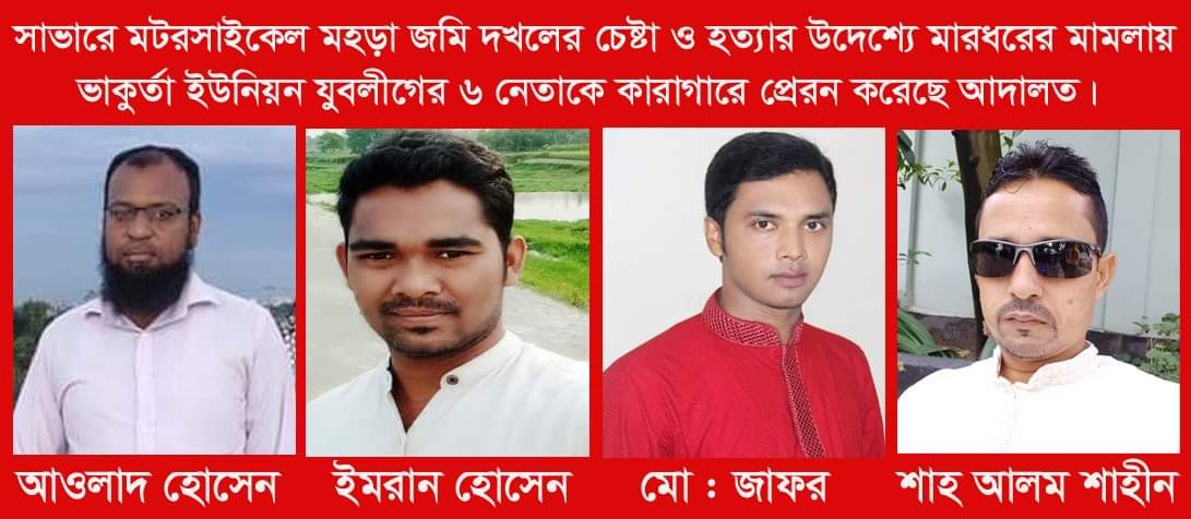 সাভারে মটরসাইকেল মহড়া দিয়ে অন্যের জমি দখলের চেষ্টা ও হত্যার উদ্দেশ্যে মারধরের মামলায় ভাকুর্তা ইউনিয়নের যুবলীগের ৬ নেতাকে কারাগারে প্রেরন করা হয়েছে। আসামীদের বিরুদ্ধে জমি দখল,চাঁদাবাজীসহ নানা অভিযোগে একাধিক মামলা রয়েছে। তাদের কারাগারে প্রেরনের খবরে এলাকায় মানুষের মাঝে স্বস্তি ফিরে এসেছে।