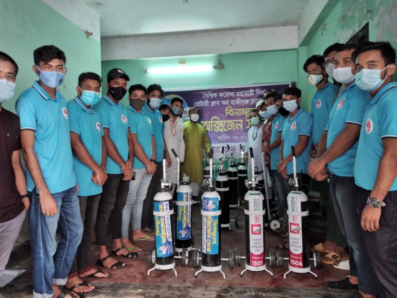 ইঞ্জিনিয়ার মোশারেফ হোসেন খোকনের পক্ষে অক্সিজেন সিলিন্ডার হস্তান্তর করেন বিশিষ্ট শিক্ষানুরাগী ও সমাজসেবক মো. শাহ আলম। রোটারী ক্লাব অব হাজীগঞ্জের পক্ষে অক্সিজেন সিলিন্ডার গ্রহণ করেন রোটারী ক্লাব অব হাজীগঞ্জের সেক্রেটারি মো. জাকির হোসেন মিয়াজী। উপস্থিত ছিলেন রোটারী ক্লাব অব হাজীগঞ্জের সাবেক এসিসট্যান্ট গভর্নর আলহাজ্জ্ব মোহাম্মদ জাফর আহম্মেদ, বর্তমান এসিসট্যান্ট গভর্নর ইঞ্জিনিয়ার নিশান রহমান, প্রেসিডেন্ট মানিক রায় প্রমুখ।