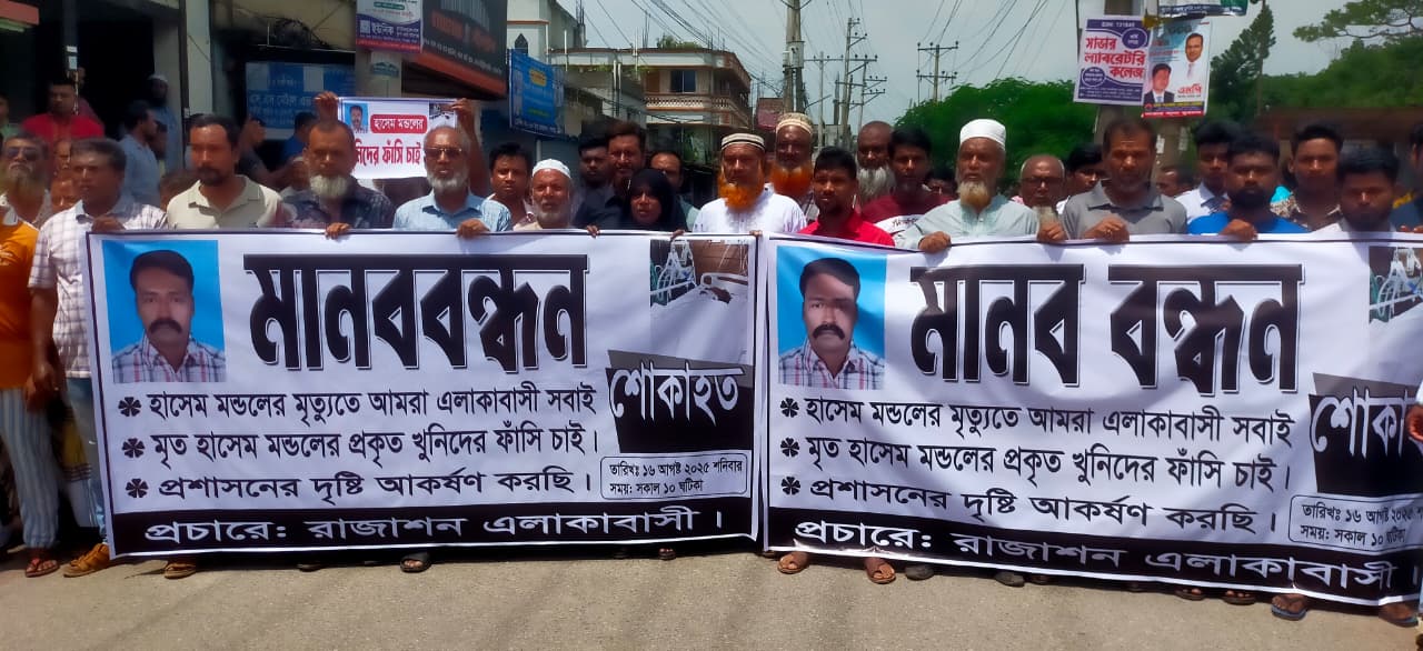 সাবেক ওমান প্রবাসী হাসেম মন্ডল কে গলা কেটে হত্যার ঘটনায় আসামিদের গ্রেপ্তার ও ফাঁসির দাবিতে সড়ক অবরোধ করে বিক্ষোভ মিছিল ও মানববন্ধন করেছে এলাকাবাসী ও ভুক্তভোগী পরিবার