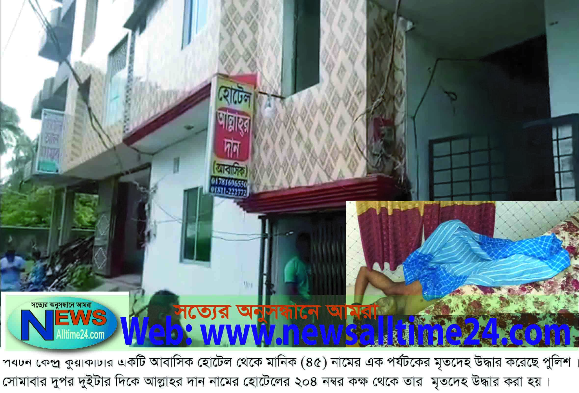 ফরিদ উদ্দিন বিপু,কলাপাড়া(পটুয়াখালী)প্রতিনিধি,২১সেপ্টেম্বর।। পর্যটন কেন্দ্র কুয়াকাটার একটি আবাসিক হোটেল থেকে মানিক (৪৫) নামের এক পর্যটকের মৃতদেহ উদ্ধার করেছে পুলিশ। সোমাবার দুপর দুইটার দিকে মহিপুর থানা পুলিশ আল্লাহর দান নামের হোটেলের
