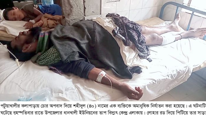 পটুয়াখালীর কলাপাড়ায় চোর অপবাদ দিয়ে শহীদুল (৪০) নামের এক ব্যক্তিকে অমানুষিক নির্যাতন করা হয়েছে। এ ঘটনাটি ঘটেছে বৃহস্পতিবার রাতে উপজেলার ধানখালী ইউনিয়নের তাপ বিদ্যুৎ কেন্দ্র এলাকায়। লোহার রড দিয়ে পিটিয়ে