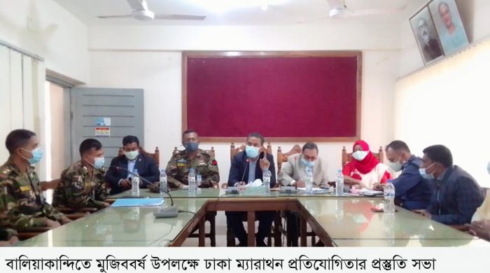 জাতির জনক বঙ্গবন্ধু শেখ মুজিবুর রহমানের জন্মশত বার্ষিকী উপলক্ষে বাংলাদেশ সেনাবাহিনীর পরিকল্পনায় জেলা ও উপজেলা প্রশাসনের সহযোগিতায় রাজবাড়ীর বালিয়াকান্দিতে ঢাকা ম্যারাথন প্রতিযোগিতার প্রস্তুতি সভা অনুষ্ঠিত হয়েছে। সোমবার দুপুরে বালিয়াকান্দি