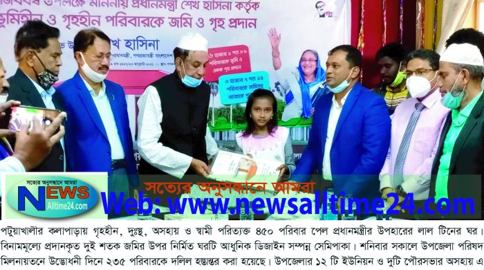 মুজিব শতবর্ষে ‘থাকবে না কেউ গৃহহীন’ অঙ্গীকারকে উপজীব্য করে পটুয়াখালীর কলাপাড়ায় গৃহহীন, দুঃস্থ, অসহায় ও স্বামী পরিত্যক্ত ৪৫০ পরিবার পেল প্রধানমন্ত্রীর উপহারের লাল টিনের ঘর। বিনামমূল্যে প্রদানকৃত দুই শতক জমির