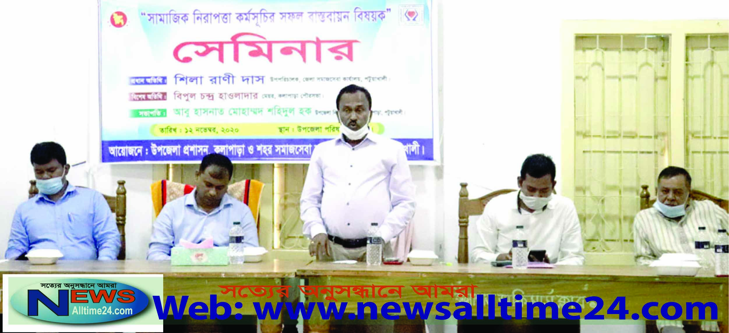 ফরিদ উদ্দিন বিপু,কলাপাড়া(পটুয়াখালী)প্রতিনিধি।। পটুয়াখালীর কলাপাড়ায় সামাজিক নিরাপত্তা কর্মসূচী সফল বাস্তবায়ন বিষয়ক সেমিনার অনুষ্ঠিত হয়েছে।  বৃহস্পতিবার সকাল ১১টায় উপজেলা প্রশাসন, কলাপাড়া ও শহর সমাজ সেবা  খেপুপাড়া,পটুয়াখালী  উদ্যোগে উপজেলা অফিসার্স ক্লাবে এ