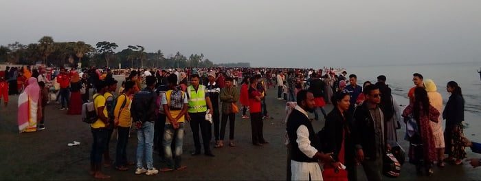 সূর্যোদয়-সূর্যাস্তের বেলাভূমি সাগর কন্যা কুয়াকাটার সৈকতে উৎসব মুখর পরিবেশে বিরাজ করছে। ইংরেজি পুরনো বছরকে বিদায় আর নতুন বছর বরণ করতে দেশি-বিদেশি হাজারো পর্যটক জড়ো হয়েছেন সৈকতে। সমুদ্রের ঢেউয়ের সাথে নেচে