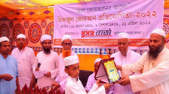 নেত্রকোনার দুর্গাপুরে পবিত্র মাহে রমজান উপলক্ষে সাপ্তাহিক সুসঙ্গ বার্তার আয়োজনে আল কোরানের আলো ‘‘হিফজুল কোরআন’’ প্রতিযোগিতা অনুষ্ঠিত হয়েছে। বৃহস্পতিবার দিনব্যাপী প্রেসক্লাব চত্বরে এ প্রতিযোগিতা অনুষ্ঠিত হয়। দুর্গাপুর উপজেলার বিভিন্ন মাদ্রাসার