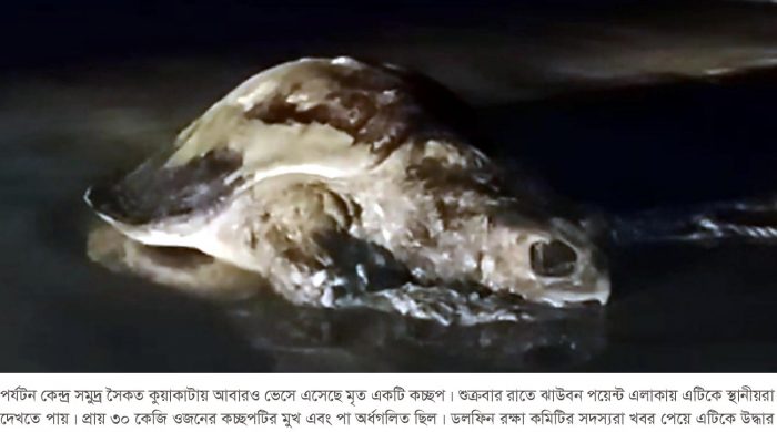 পর্যটন কেন্দ্র সমুদ্র সৈকত কুয়াকাটায় আবারও ভেসে এসেছে মৃত একটি কচ্ছপ। শুক্রবার রাতে ঝাউবন পয়েন্ট এলাকায় এটিকে স্থানীয়রা দেখতে পায়। প্রায় ৩০ কেজি ওজনের কচ্ছপটির মুখ এবং পা অর্ধগলিত ছিল।