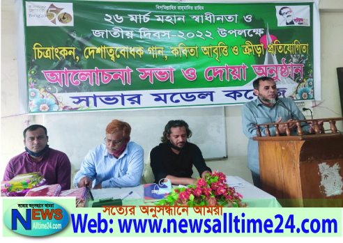 ২৬ শে মার্চ মহান স্বাধীনতা ও জাতীয় দিবস উপলক্ষে সাভার মডেল কলেজ মাঠে আলোচনা সভা ও সাংস্কৃতি অনুষ্ঠানের আয়োজন করা হয়েছে। শনিবার সকালে জাতীয় সংগীত ও জাতীয় পতাকা উত্তোলনের মাধ্যম