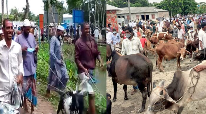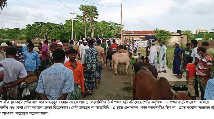 করোনাভাইরাসের সংক্রমণ রোধে সরকার সারাদেশে সর্বাত্মক লকডাউন ঘোষণা করেছে। এ লকডাউন উপেক্ষা করে কলাপাড়ার কুয়াকাটা পৌর এলাকায় বসেছে জমজমাট পশুর হাট। পৌর সদরের ৭ নং ওয়ার্ডের মাহবুবুর রহমান সড়কে শনিবার