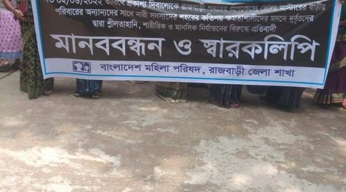রাজবাড়ী পৌর এলাকার ভবানীপুরে মাস্টার বাড়ীর সীমানা প্রাচীর ভেঙে নারীসহ পাঁচজনকে পিটিয়ে জখম ও নির্যাতন করার প্রতিবাদে মানববন্ধন করেছে বাংলাদেশ মহিলা পরিষদ রাজবাড়ী শাখা। রোববার (৫ জুন) সকাল ১০ টা