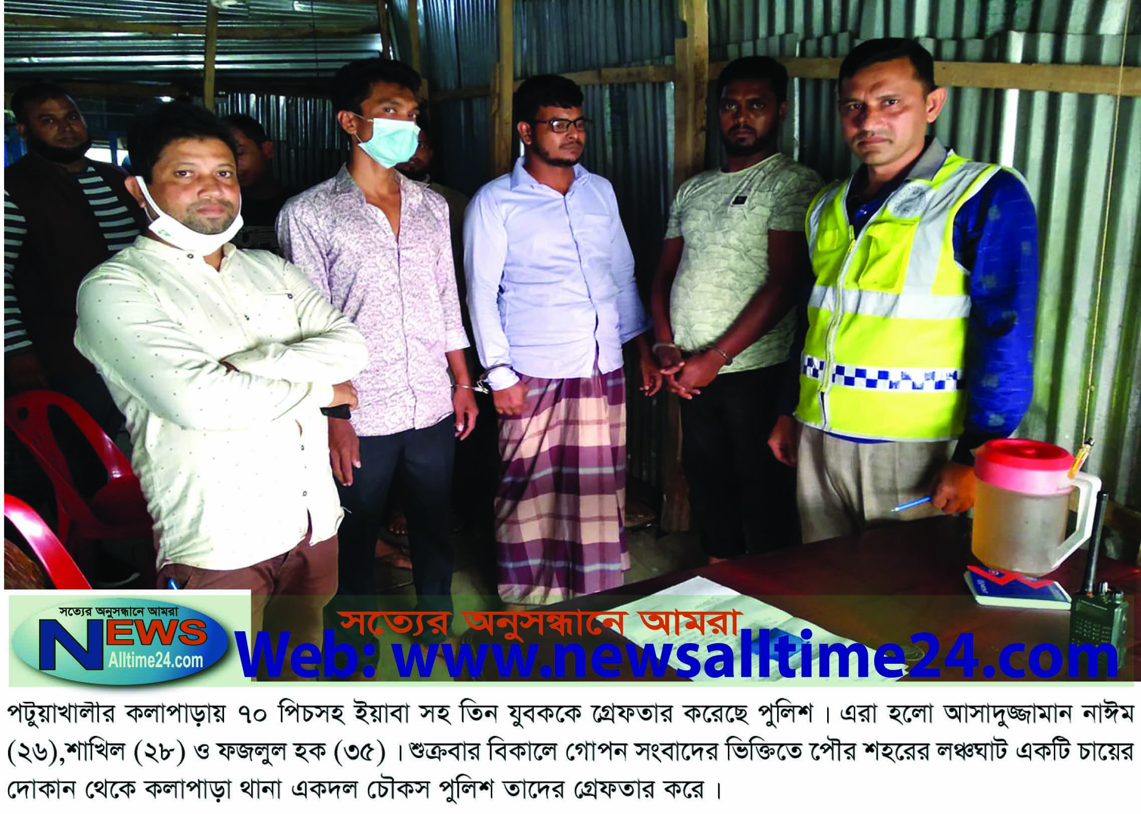 মো.ফরিদ উদ্দিন বিপু,কলাপাড়া(পটুয়াখালী)প্রতিনিধি,২০ নভেম্বর।। পটুয়াখালীর কলাপাড়ায় ৭০ পিচসহ ইয়াবা সহ তিন যুবককে আটক করেছে পুলিশ। এরা হলো আসাদুজ্জামান নাঈম (২৬),শাখিল (২৮) ও ফজলুল হক (৩৫)। শুক্রবার বিকালে গোপন সংবাদের ভিক্তিতে