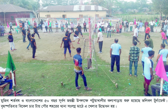 মুজিব শর্তবষ ও বাংলাদেশের ৫০ বছর সূর্বণ জয়ন্তী উপলক্ষে পটুয়াখালীর কলাপাড়ায় শুরু হয়েছে ভলিবল টুর্ণামেন্ট। বৃহস্পতিবার বিকেল চার টায় পৌর শহরের থানা সংলগ্ন মাঠে এ খেলার উদ্বোধন করেন প্রধান অতিথি