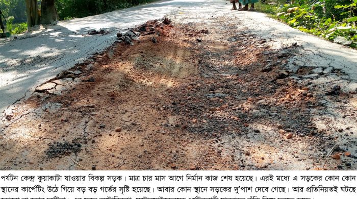 পর্যটন কেন্দ্র কুয়াকাটা যাওয়ার বিকল্প সড়ক। মাত্র চার মাস আগে নির্মান কাজ শেষ হয়েছে। এরই মধ্যে এ সড়কের কোন কোন স্থানের কার্পেটিং উঠে গিয়ে বড় বড় গর্তের সৃষ্টি হয়েছে। আবার আরো..