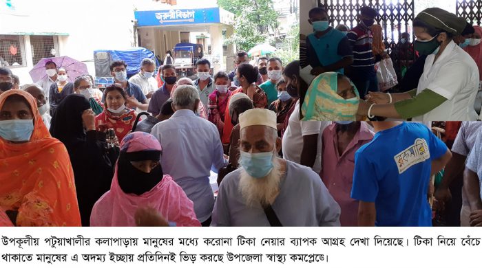 উপক‚লীয় পটুয়াখালীর কলাপাড়ায় মানুষের মধ্যে করোনা টিকা নেয়ার ব্যাপক আগ্রহ দেখা দিয়েছে। টিকা নিয়ে বেঁচে থাকাতে মানুষের এ অদম্য ইচ্ছায় প্রতিদিনই ভিড় করছে উপজেলা স্বাস্থ্য কমপ্লেক্সে। কেউ কেউ হাসপাতালের অফিস
