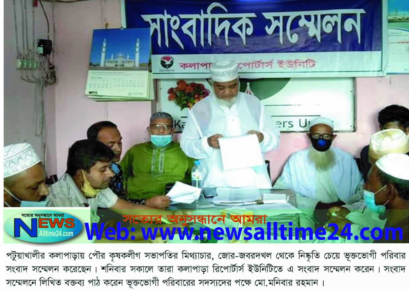 মো.ফরিদ উদ্দিন বিপু,কলাপাড়া(পটুয়াখালী)প্রতিনিধি, ২৫ জুলাই।। পটুয়াখালীর কলাপাড়ায় পৌর কৃষকলীগ সভাপতির মিথ্যাচার, জোর-জবরদখল থেকে নিষ্কৃতি চেয়ে ভূক্তভোগী পরিবার সংবাদ সম্মেলন করেছেন। শনিবার ১২টায় তারা কলাপাড়া রিপোর্টার্স ইউনিটিতে এ সংবাদ সম্মেলন করেন।