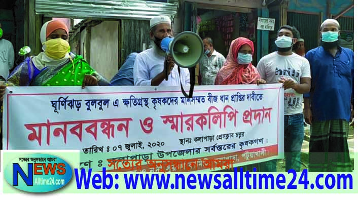 মো.ফরিদ উদ্দিন বিপু,কলাপাড়া(পটুয়াখালী)প্রতিনিধি,০৭জুলাই।। পটুয়াখালীর কলাপাড়ায় ঘূর্ণিঝড় বুলবুল এ ক্ষতিগ্রস্থ কৃষকদের মানসম্মত বীজ ধান প্রাপ্তির দাবীতে মানববন্ধন অনুষ্ঠিত হয়েছে। পানি জাদুঘর ও নদী সুরক্ষা কমিটি কলাপাড়ার আয়োজনে মঙ্গলবার সকালে কলাপাড়া প্রেসক্লাব