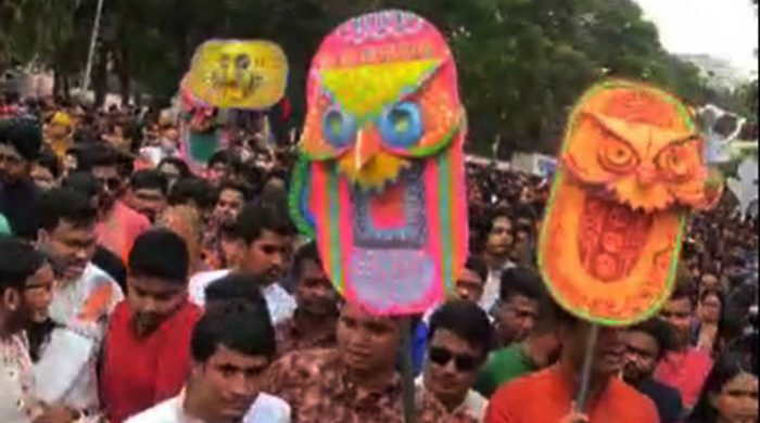 পুরোনো গ্লানি, হতাশা আর মলিনতাকে পেছনে ফেলে নতুন উদ্যমে এগিয়ে যাওয়ার প্রত্যাশায় বাংলা নববর্ষের প্রথম দিনে পয়লা বৈশাখে ঢাকা বিশ্ববিদ্যালয়ে শুরু হয়েছে মঙ্গল শোভাযাত্রা। আজ বৃহস্পতিবার বাংলা নববর্ষের প্রথম দিনে