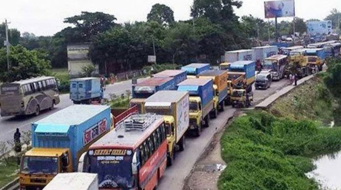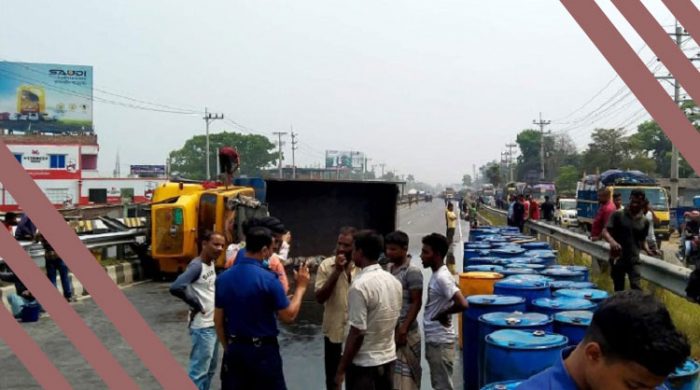 টাঙ্গাইল মহাসড়কের ওপর চাকা ফেটে ১১ টন সয়াবিন তেল নিয়ে মহাসড়কের ওপর উল্টে গেছে উত্তরবঙ্গগামী একটি ট্রাক। বৃহস্পতিবার (২৪ মার্চ) বেলা সাড়ে ১১টার দিকে ঢাকা-টাঙ্গাইল-বঙ্গবন্ধু মহাসড়কের আশেকপুর বাইপাস এলাকায় এ