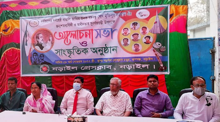 স্বাধীনতার সুবর্ণজয়ন্তী ও বঙ্গবন্ধু শেখ মুজিবুর রহমানের জন্মশতবার্ষিকী উপলক্ষে নড়াইল প্রেসক্লাবের উদ্যোগে আলোচনা সভা এবং সাংস্কৃতিক অনুষ্ঠান অনুষ্ঠিত হয়েছে। সোমবার (২৮ মার্চ) বিকেলে প্রেসক্লাব চত্বরে এসব অনুষ্ঠানের আয়োজন করা হয়।